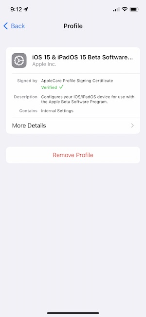 - La siguiente pantalla mostrará el perfil beta. Toca el rojo Eliminar perfil Enlace.